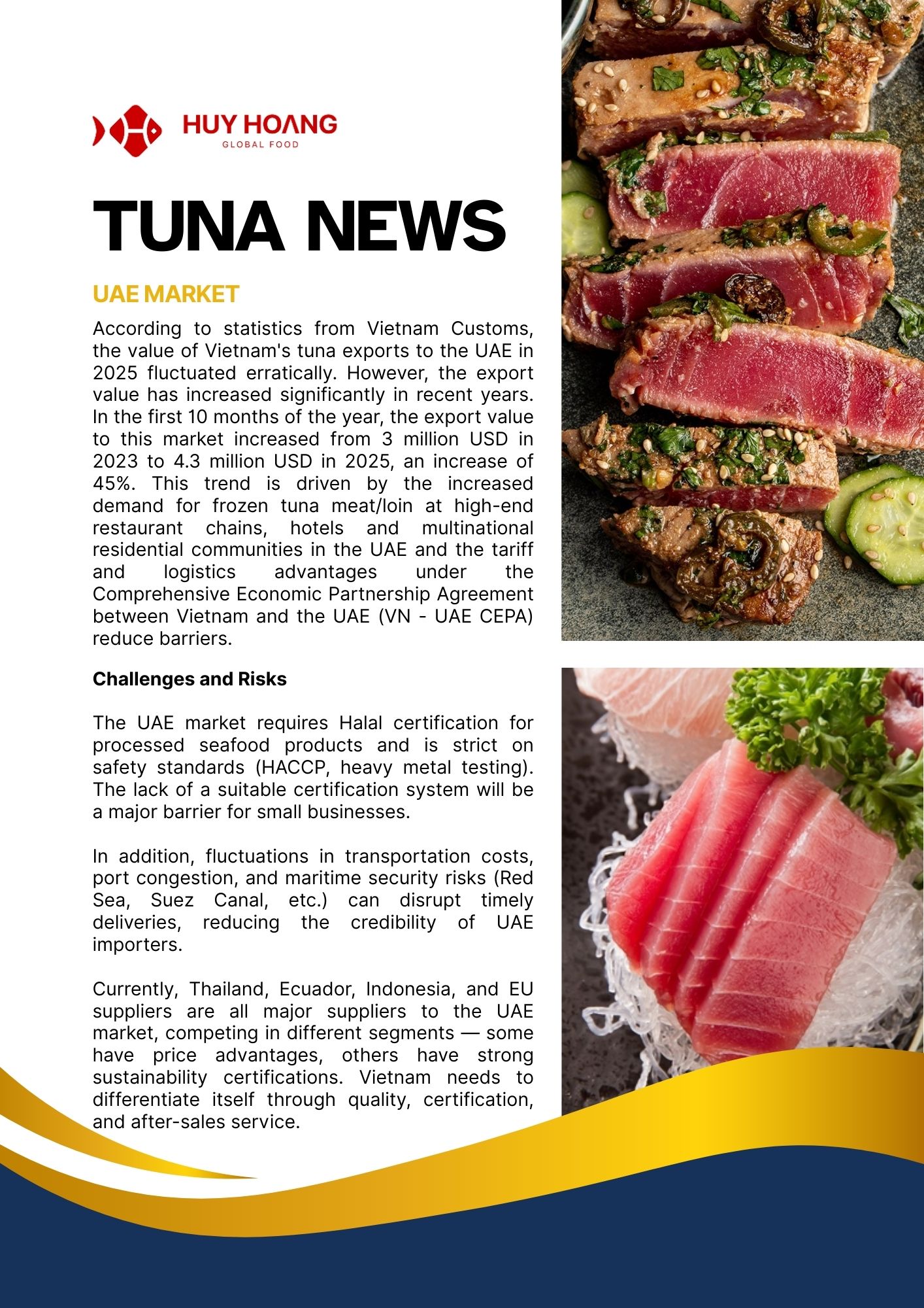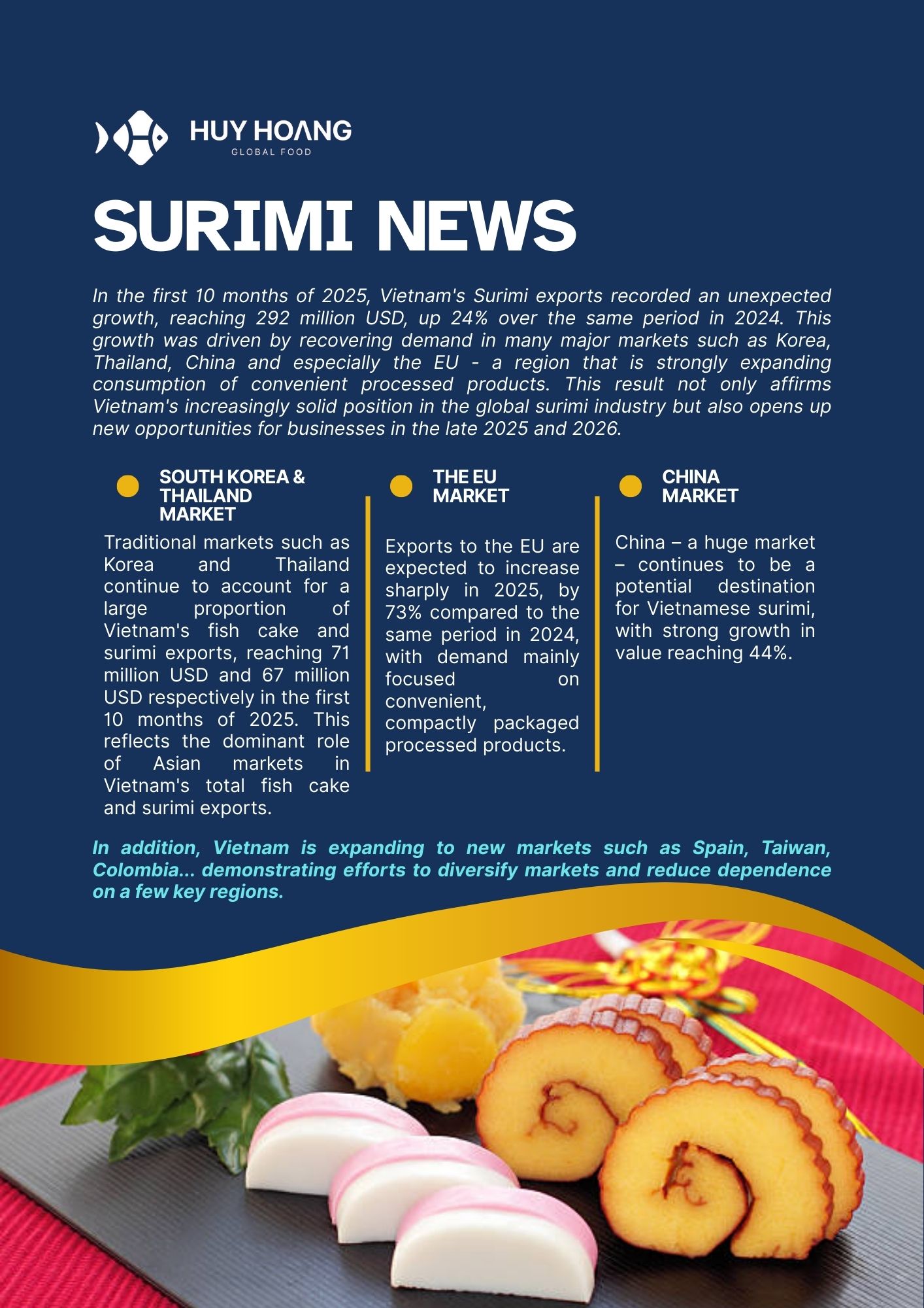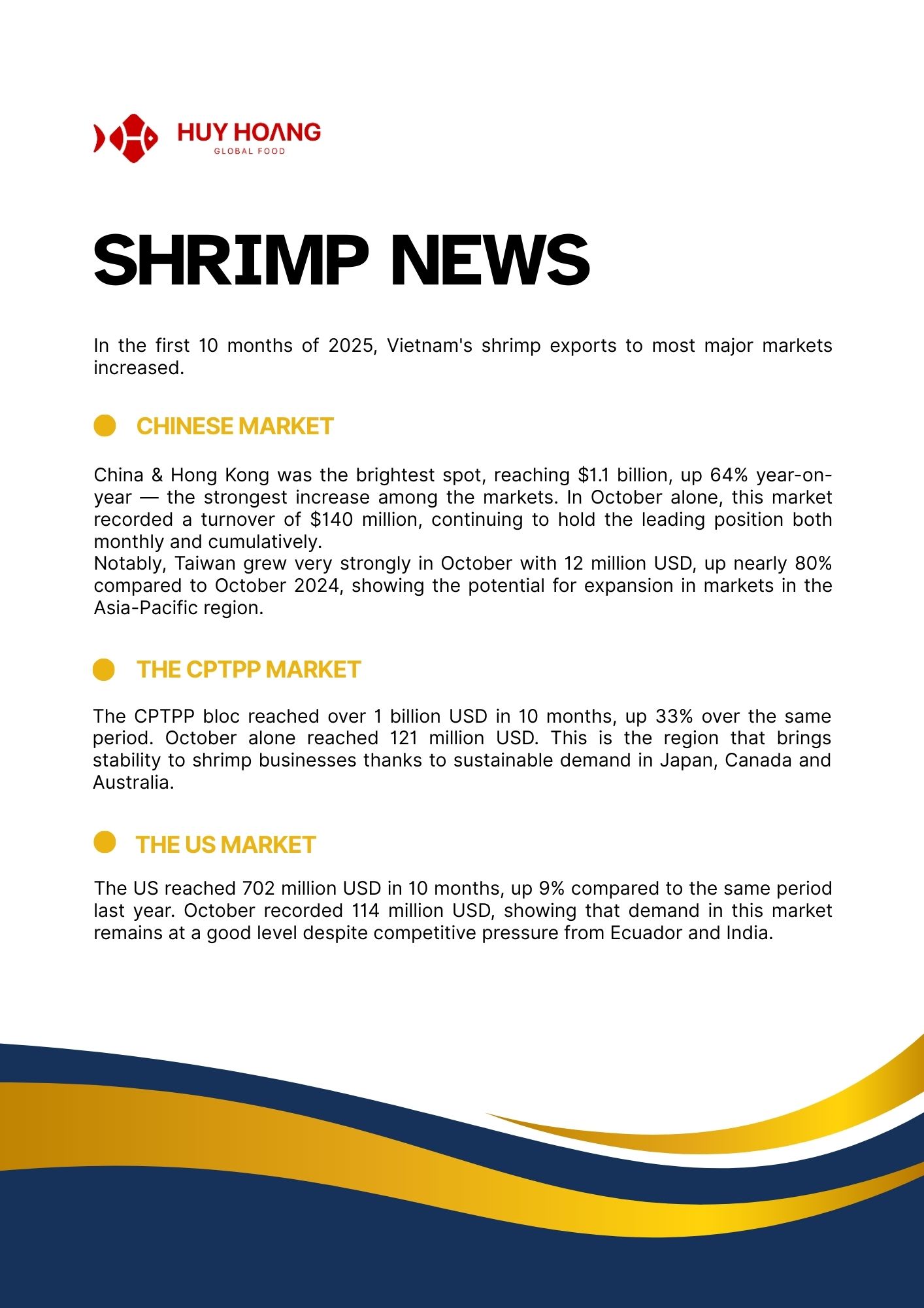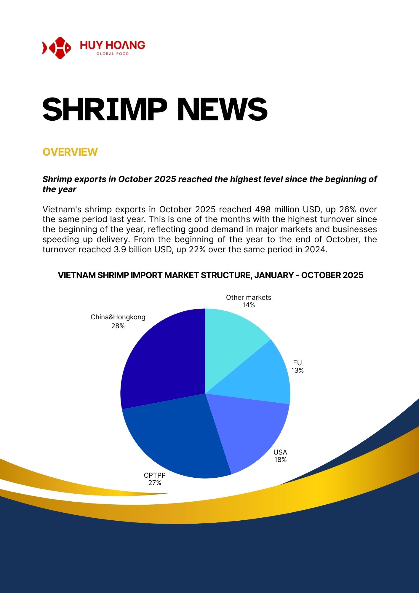 In the first 10 months of 2025, Vietnam’s seafood sector continued its upward trend across key product groups. Pangasius exports reached USD 1.8 billion, with strong growth in China–Hong Kong, CPTPP, and the EU, while high-quality fry programs in An Giang support long-term raw material stability. Shrimp exports hit USD 3.9 billion (+22%), marking the highest monthly performance in October, driven by strong demand from China, CPTPP, the U.S., and the EU despite supply risks from flood losses in Phu Yen. Tuna exports reached USD 791 million, slightly lower than last year, but markets such as the UAE and EU continued to expand. Surimi exports surged 24% thanks to strong demand in Korea, Thailand, China, and the EU, reinforcing Vietnam’s rising position in the global market.