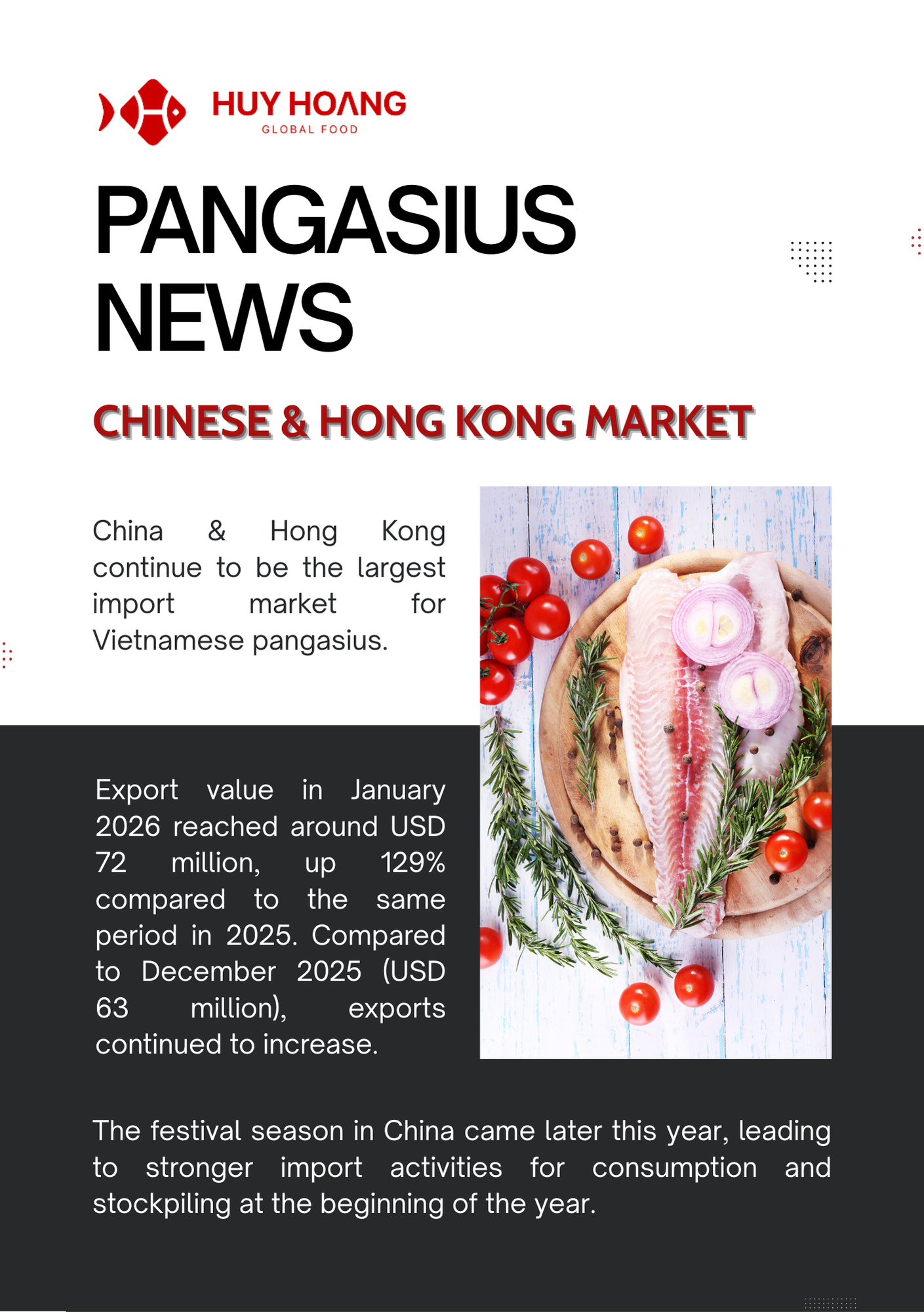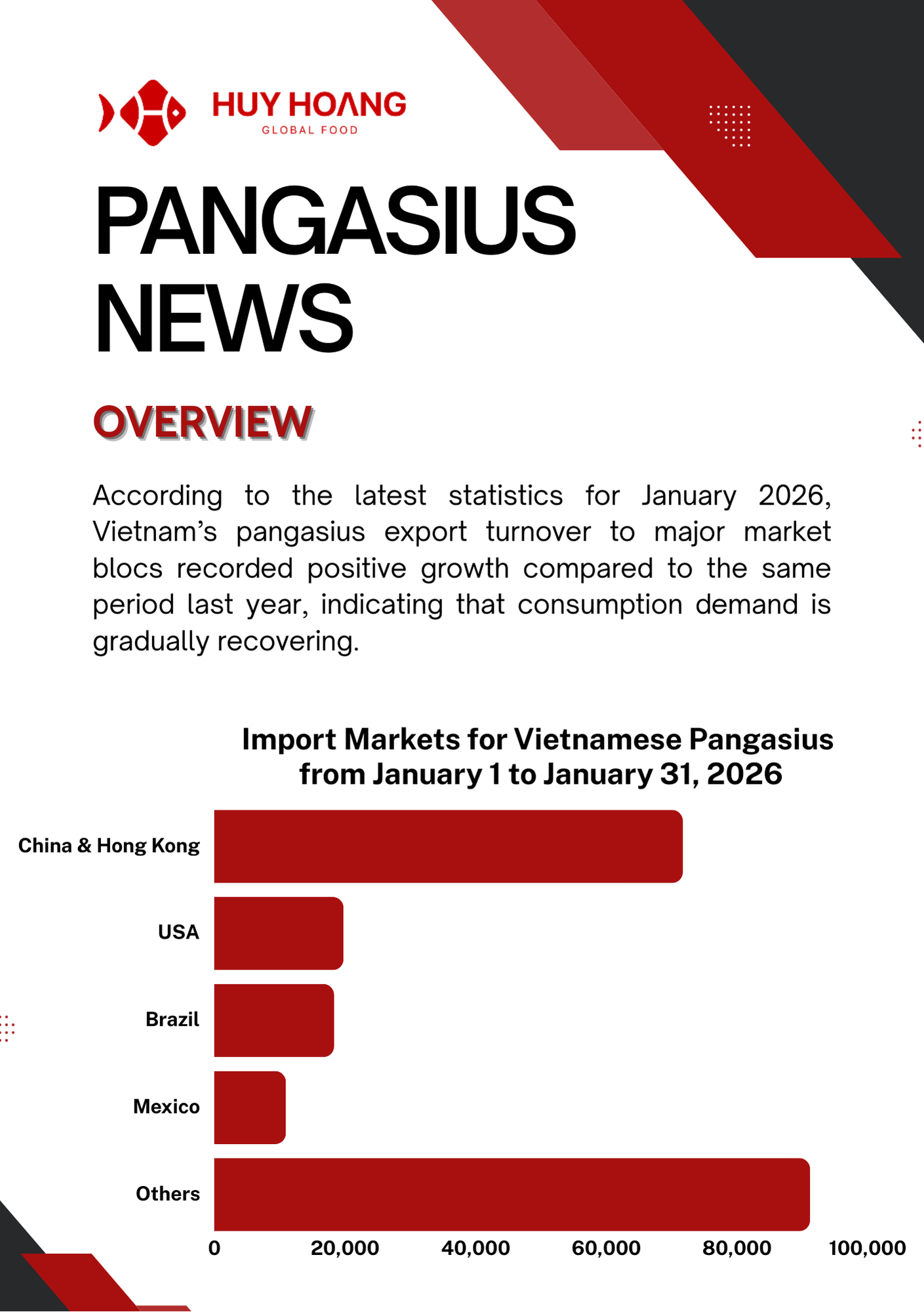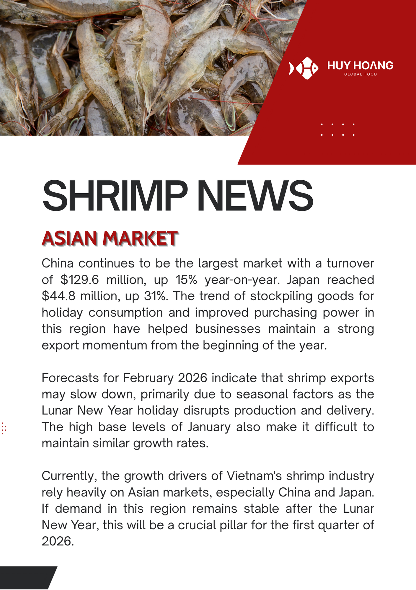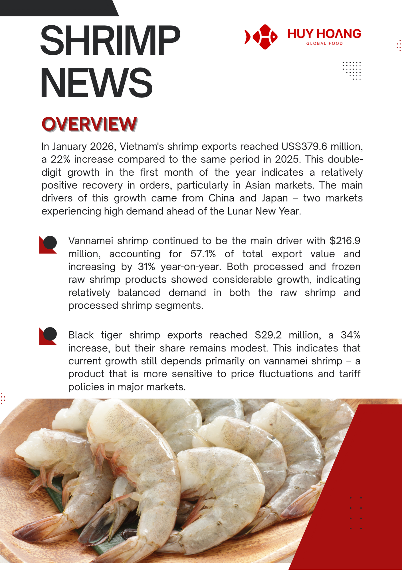 In January 2026, Vietnam’s seafood exports showed positive momentum, particularly for pangasius and shrimp. Pangasius exports increased strongly in major markets, with China & Hong Kong reaching about USD 72 million (+129%), while CPTPP markets also recorded solid growth, highlighting continued demand recovery. The EU market saw moderate improvement due to shortages of other whitefish, making pangasius a competitive alternative. Meanwhile, shrimp exports reached USD 379.6 million (+22%), driven mainly by strong demand from China and Japan ahead of the Lunar New Year. However, geopolitical tensions in the Middle East and rising logistics costs may pose potential risks to seafood trade in the coming months.