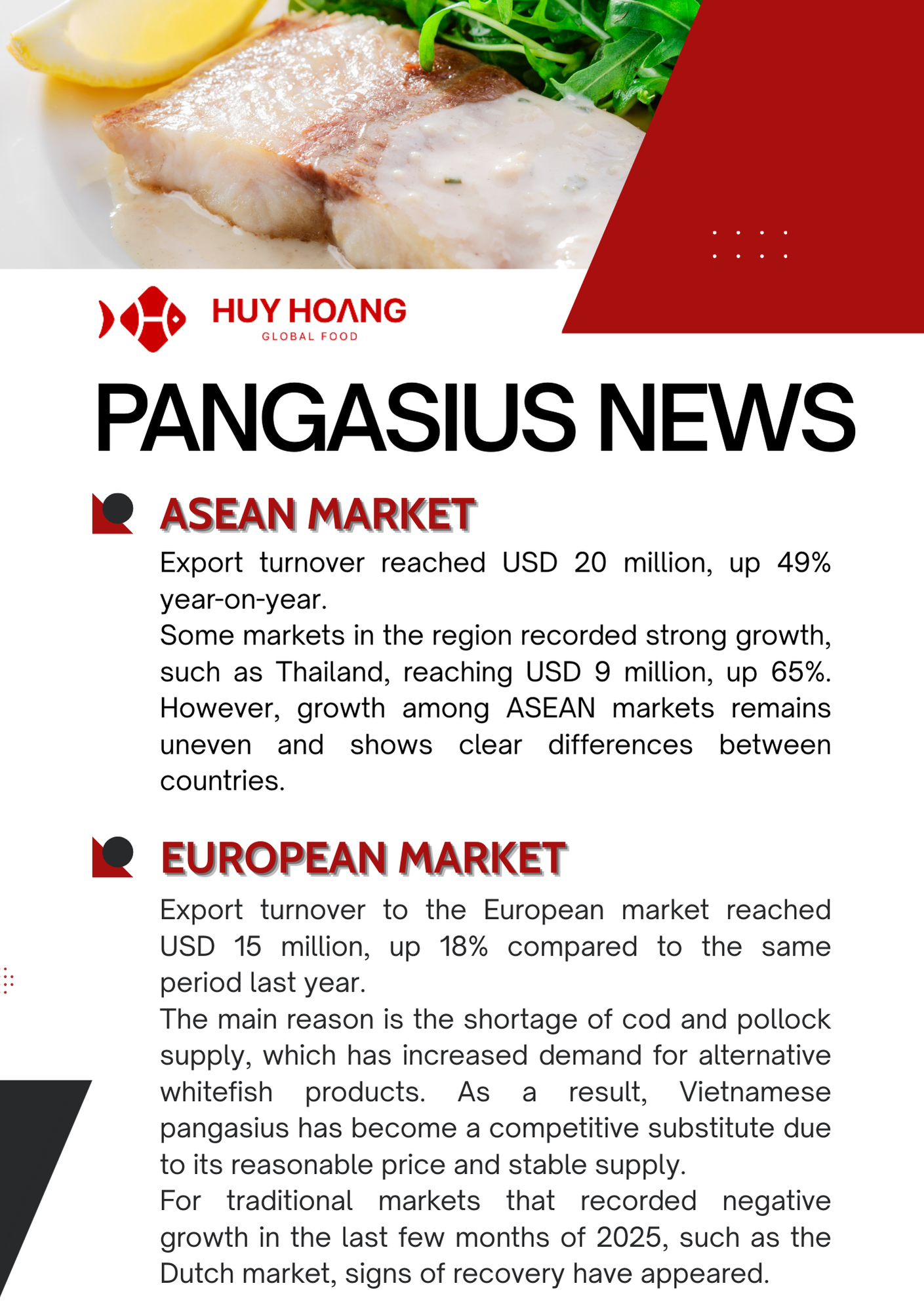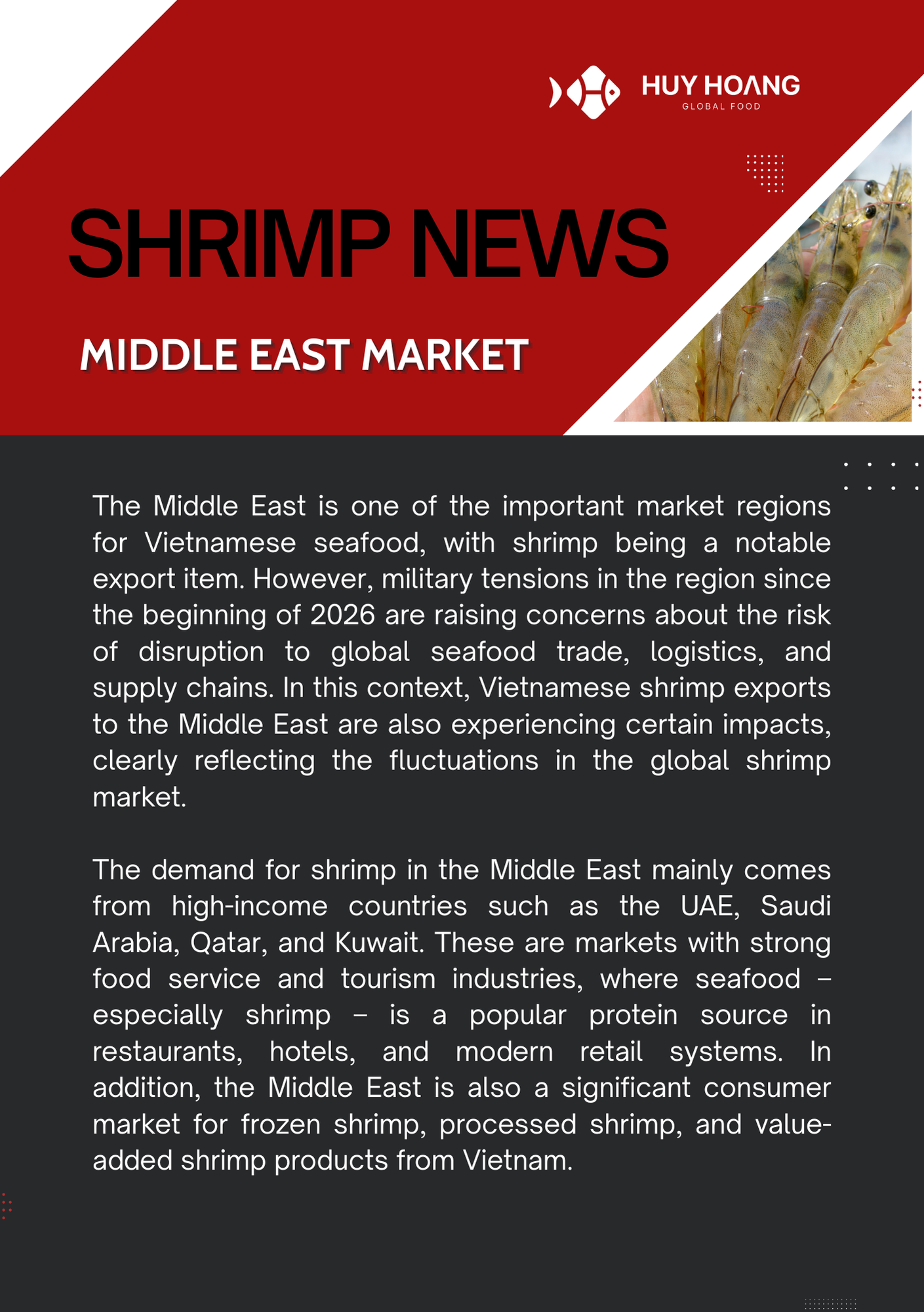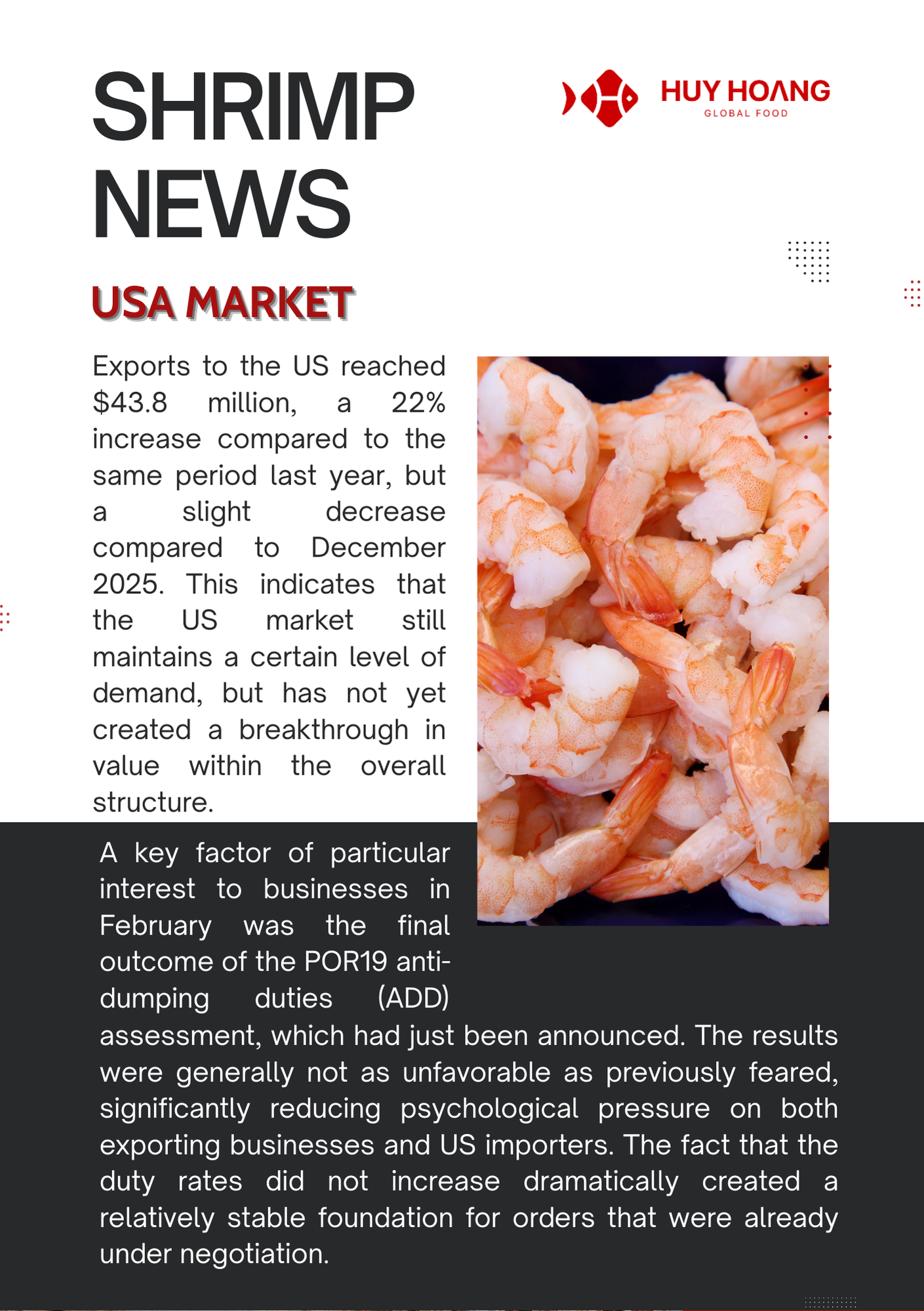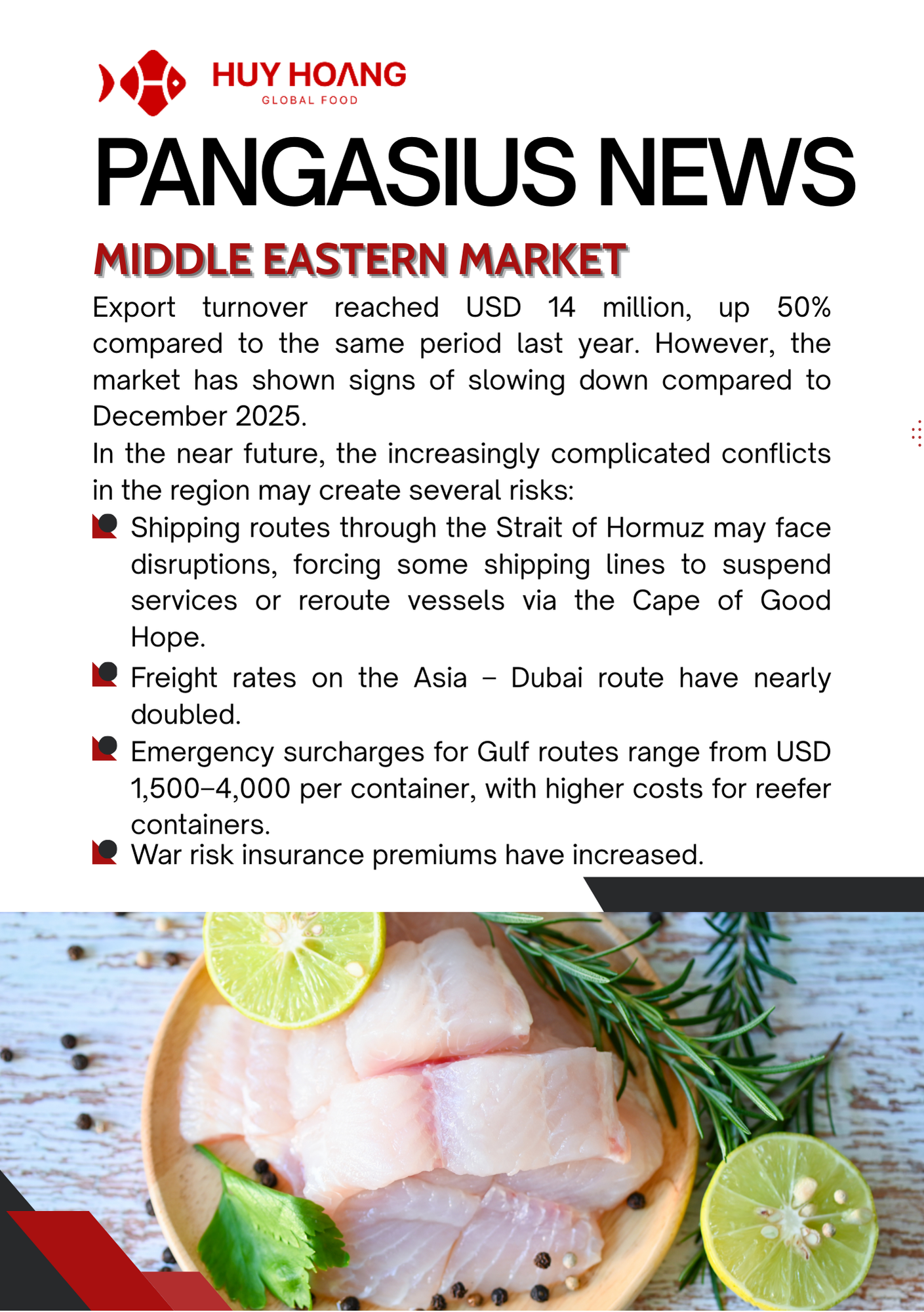 In January 2026, Vietnam’s seafood exports showed positive momentum, particularly for pangasius and shrimp. Pangasius exports increased strongly in major markets, with China & Hong Kong reaching about USD 72 million (+129%), while CPTPP markets also recorded solid growth, highlighting continued demand recovery. The EU market saw moderate improvement due to shortages of other whitefish, making pangasius a competitive alternative. Meanwhile, shrimp exports reached USD 379.6 million (+22%), driven mainly by strong demand from China and Japan ahead of the Lunar New Year. However, geopolitical tensions in the Middle East and rising logistics costs may pose potential risks to seafood trade in the coming months.