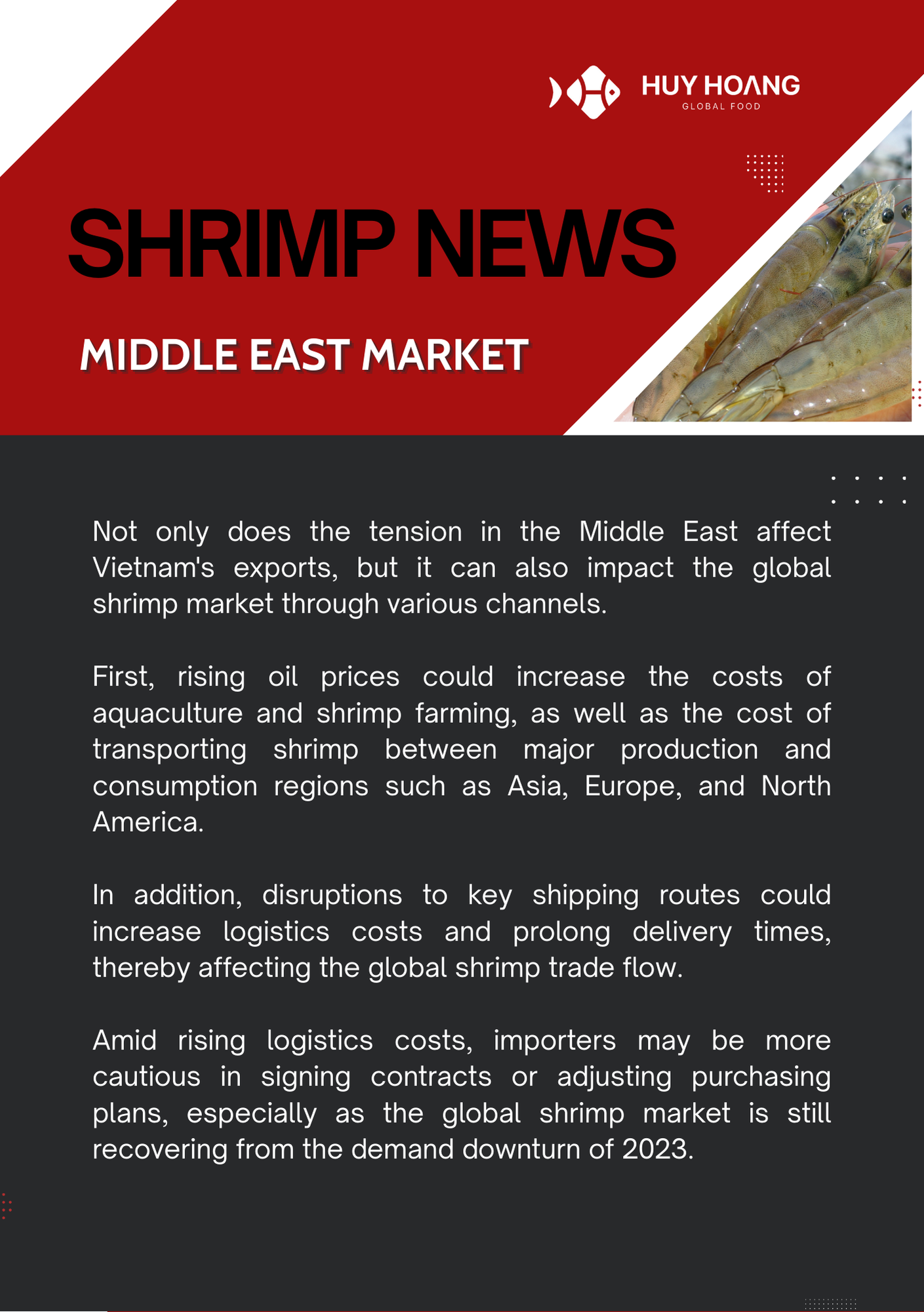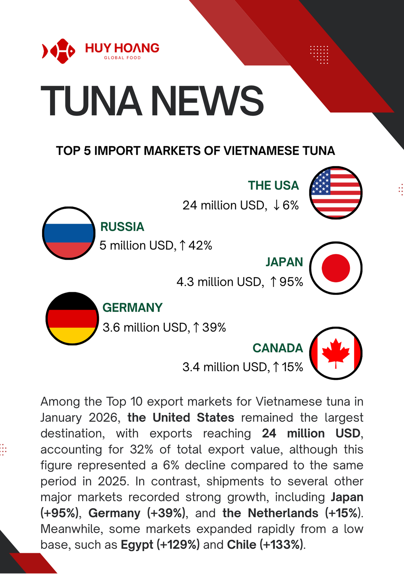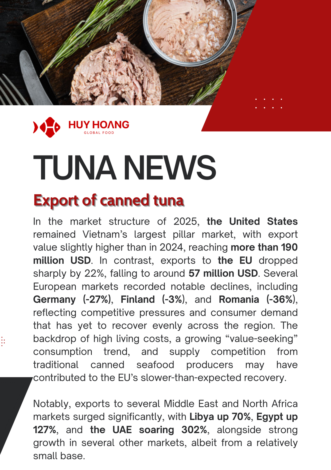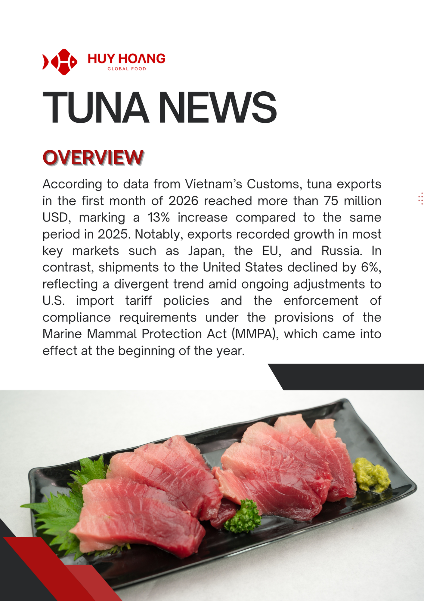 In January 2026, Vietnam’s seafood exports showed positive momentum, particularly for pangasius and shrimp. Pangasius exports increased strongly in major markets, with China & Hong Kong reaching about USD 72 million (+129%), while CPTPP markets also recorded solid growth, highlighting continued demand recovery. The EU market saw moderate improvement due to shortages of other whitefish, making pangasius a competitive alternative. Meanwhile, shrimp exports reached USD 379.6 million (+22%), driven mainly by strong demand from China and Japan ahead of the Lunar New Year. However, geopolitical tensions in the Middle East and rising logistics costs may pose potential risks to seafood trade in the coming months.