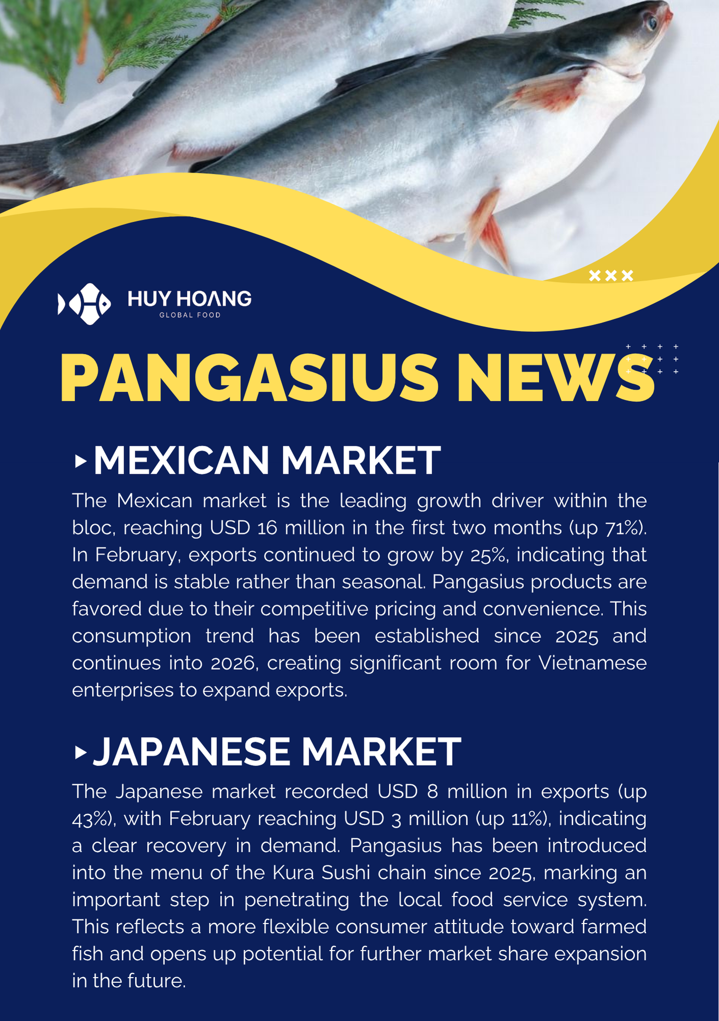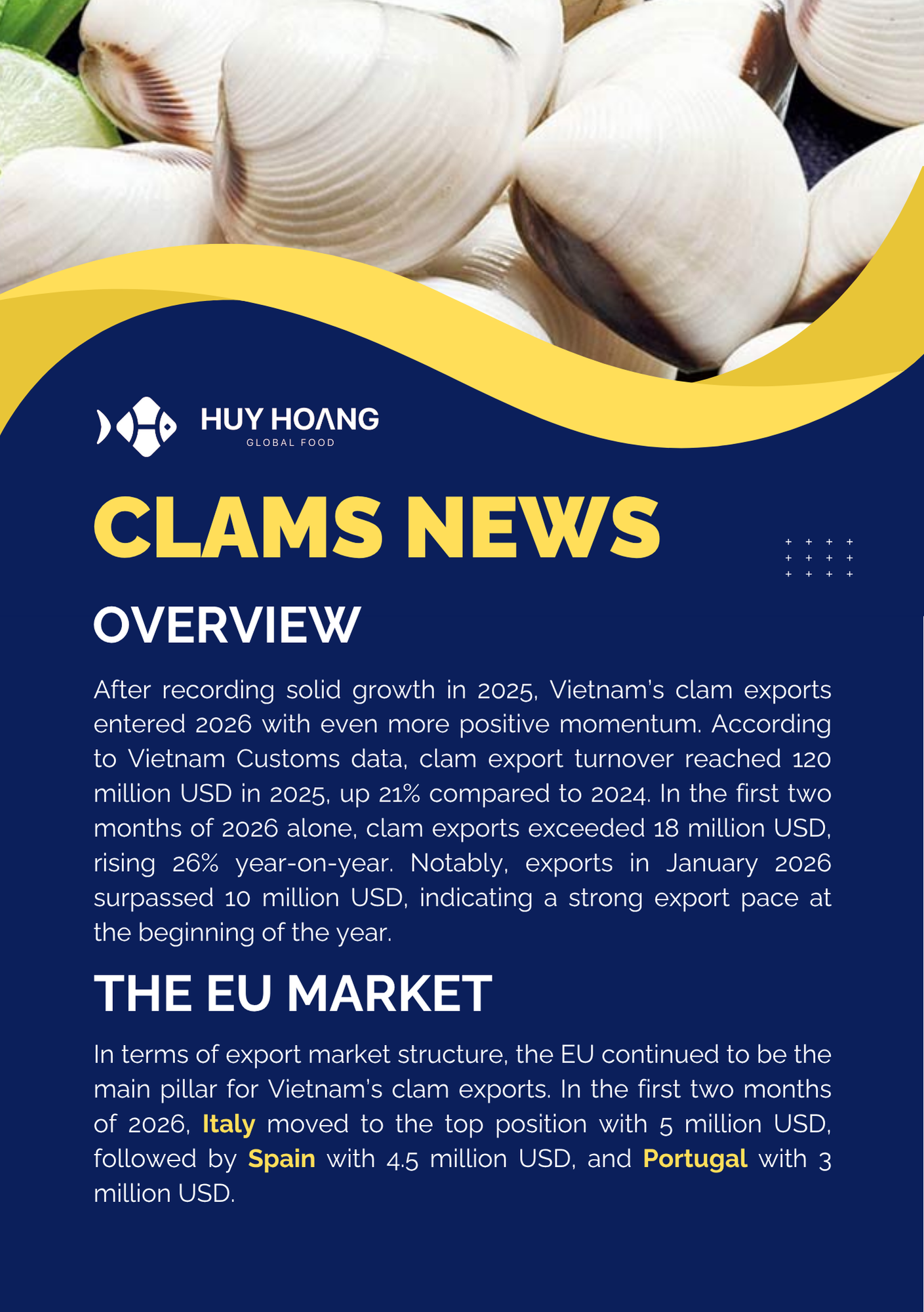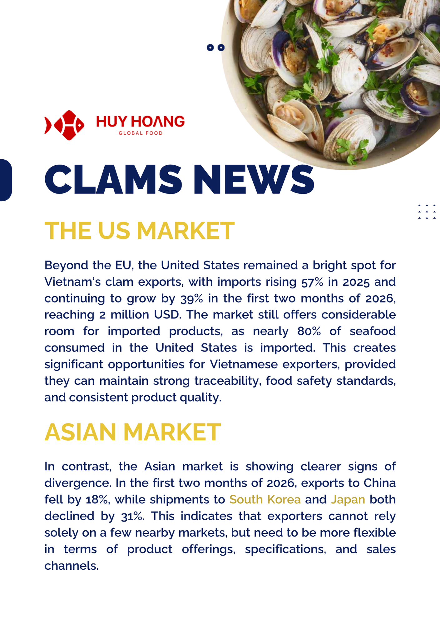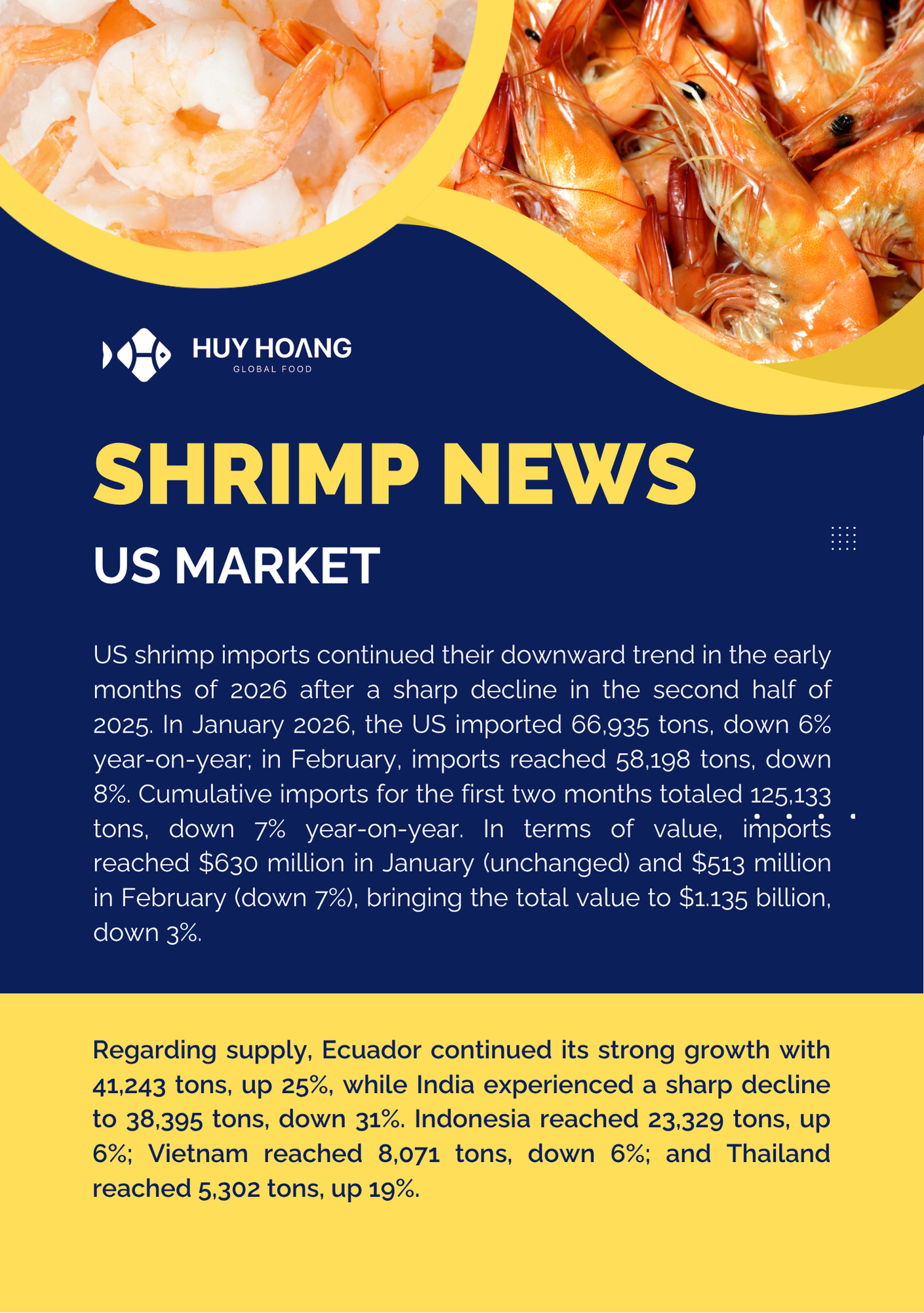 Vietnam’s seafood exports in early 2026 continue to show encouraging growth, especially in value-driven markets. Pangasius exports to CPTPP countries increased strongly, led by Mexico, Japan, and the UK, reflecting rising demand for affordable and value-added products, while the industry gradually shifts from volume-based to value-based growth. In the shrimp sector, global raw shrimp prices declined across major producing countries amid rising production costs, while stable demand from Japan helped maintain export momentum despite pressure in the US market. Tuna exports posted strong gains in Spain and the UAE, while clam exports continued to expand in the EU and the US, though Asian markets weakened. Overall, Vietnam’s seafood industry is demonstrating resilience by diversifying markets and improving product value, despite ongoing cost pressures and global market volatility.
