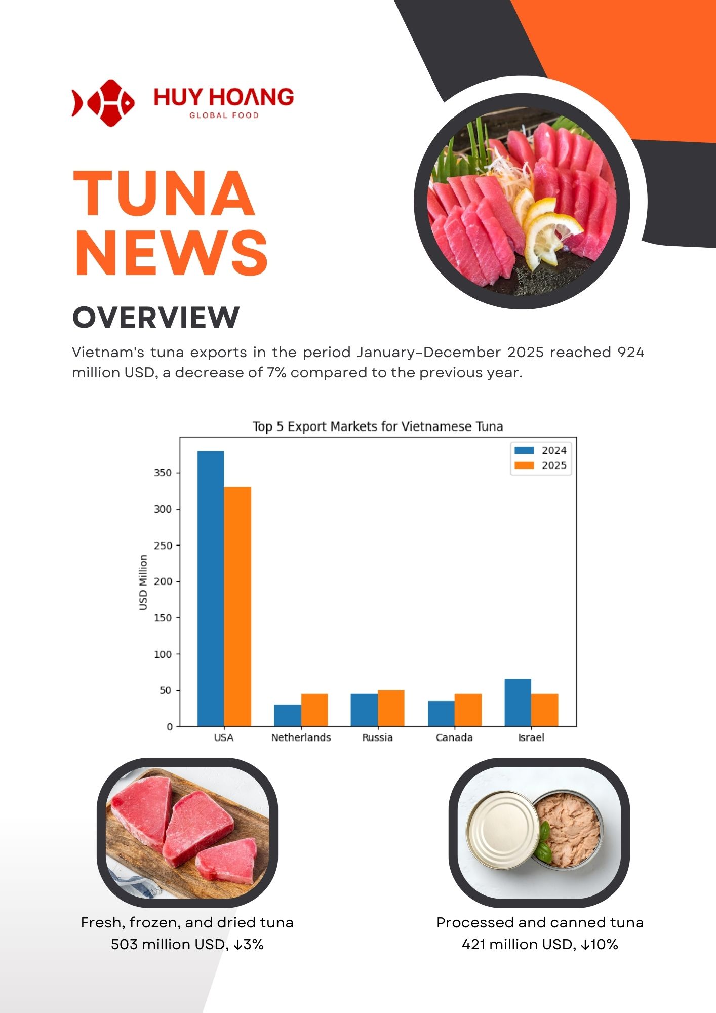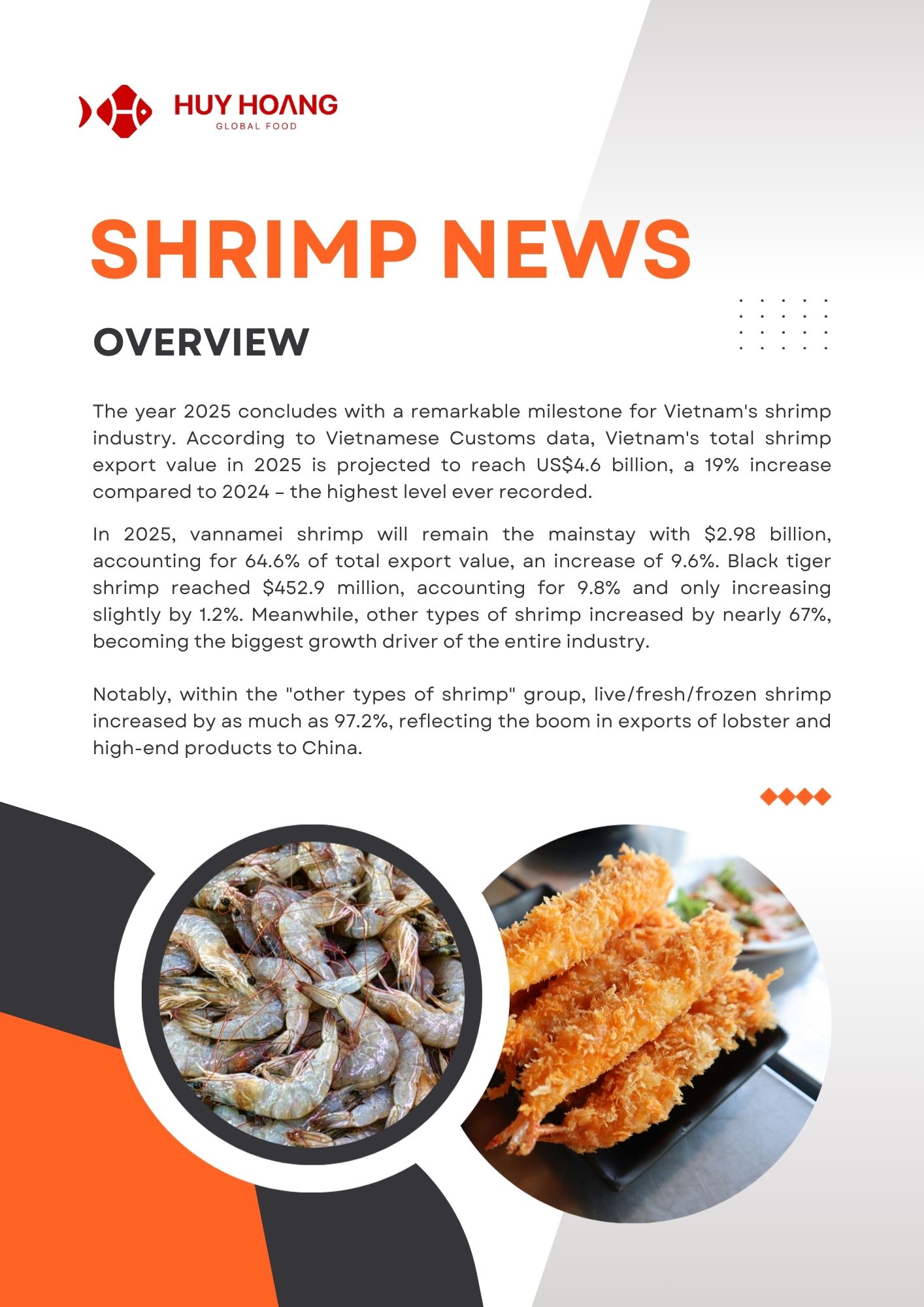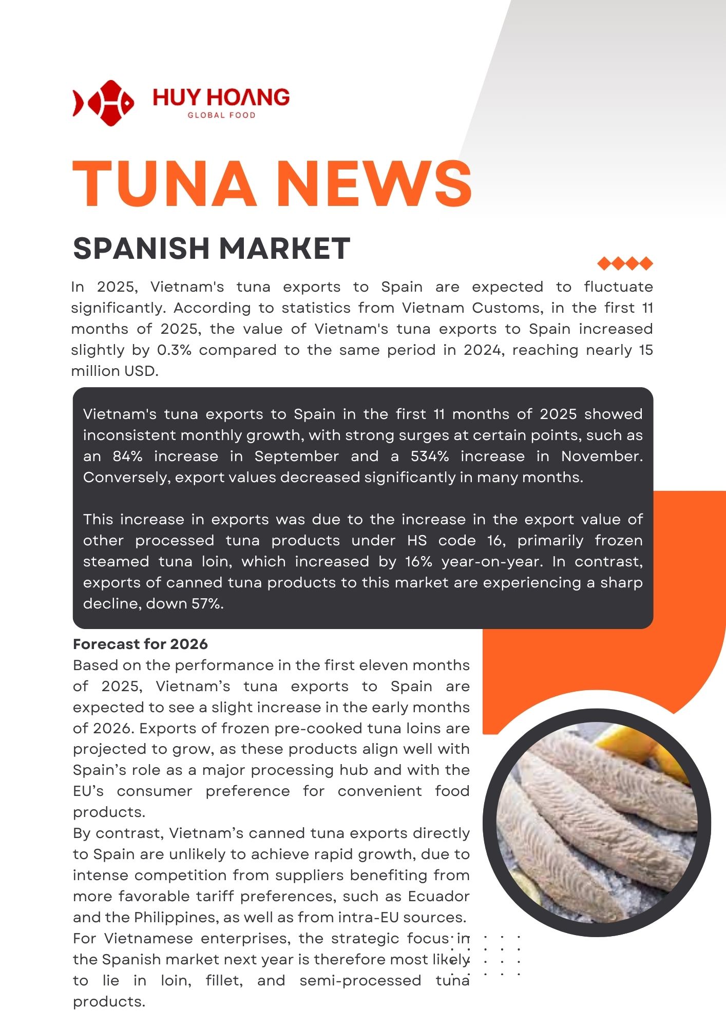 By the end of November 2025, Vietnam’s seafood exports continued to grow steadily, led by pangasius exceeding USD 2 billion (+9%) and shrimp reaching USD 4.3 billion (+21%), with strong demand from China–Hong Kong, CPTPP, the EU, and Japan. Pangasius benefited from stable recovery and improved raw material conditions, while shrimp remained the key growth driver despite U.S. trade pressures and supply risks from flooding. Tuna exports reached USD 856 million (-5%), maintaining a presence in over 110 markets, with opportunities emerging in value-added products in Europe. Overall, diversification, processing capacity, and value-added strategies continue to support the resilience of Vietnam’s seafood industry.