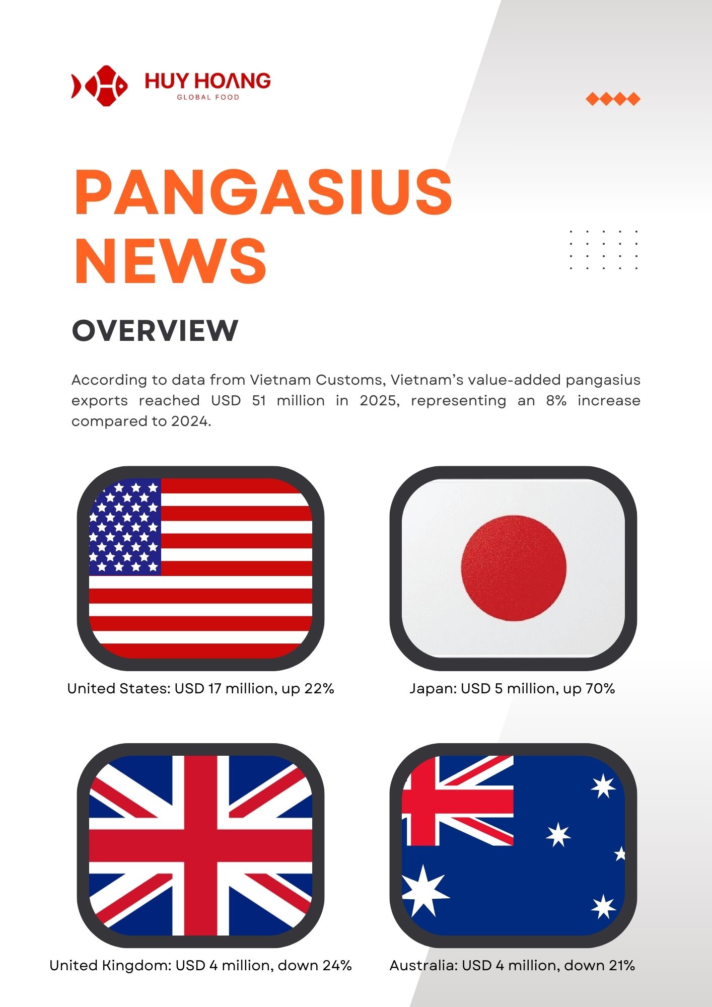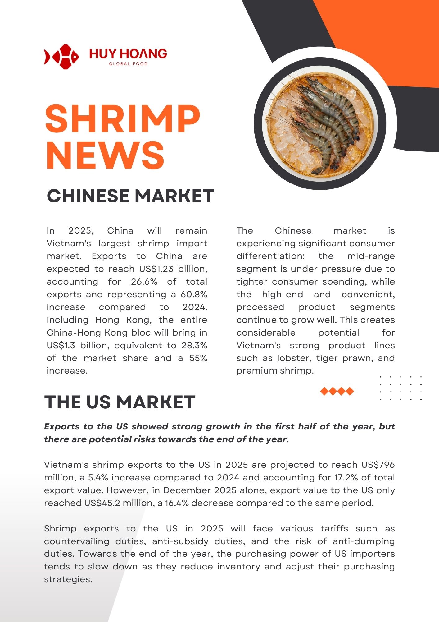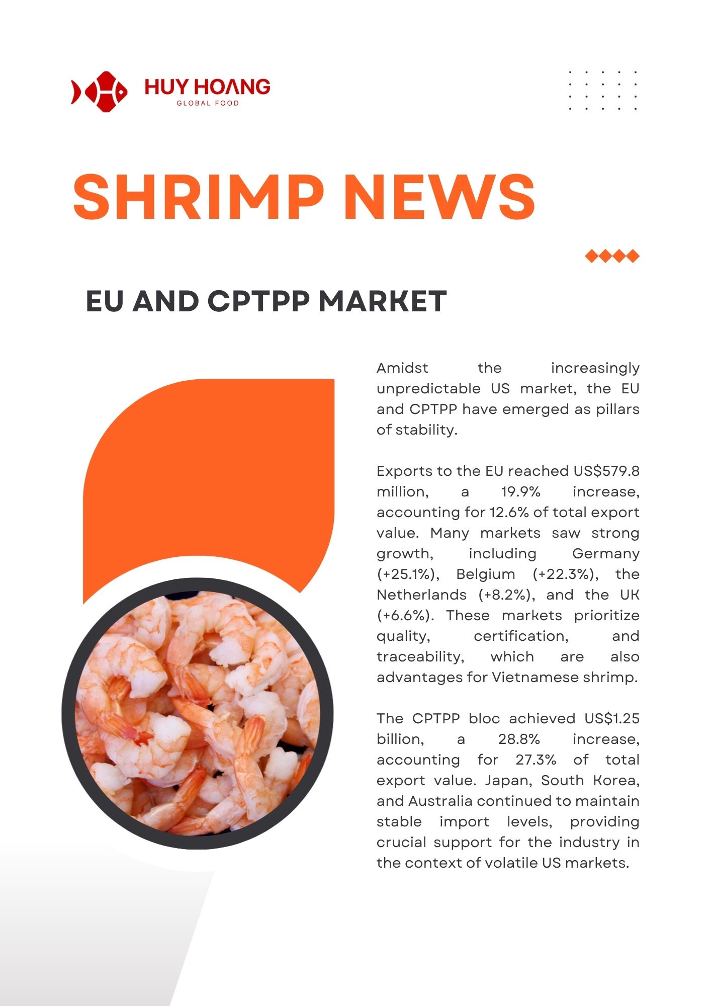 By the end of November 2025, Vietnam’s seafood exports continued to grow steadily, led by pangasius exceeding USD 2 billion (+9%) and shrimp reaching USD 4.3 billion (+21%), with strong demand from China–Hong Kong, CPTPP, the EU, and Japan. Pangasius benefited from stable recovery and improved raw material conditions, while shrimp remained the key growth driver despite U.S. trade pressures and supply risks from flooding. Tuna exports reached USD 856 million (-5%), maintaining a presence in over 110 markets, with opportunities emerging in value-added products in Europe. Overall, diversification, processing capacity, and value-added strategies continue to support the resilience of Vietnam’s seafood industry.