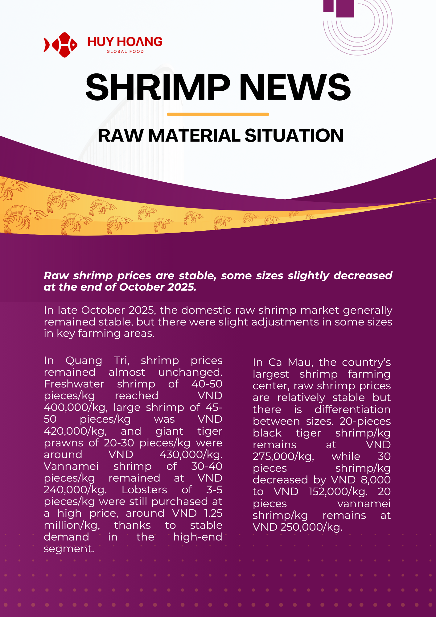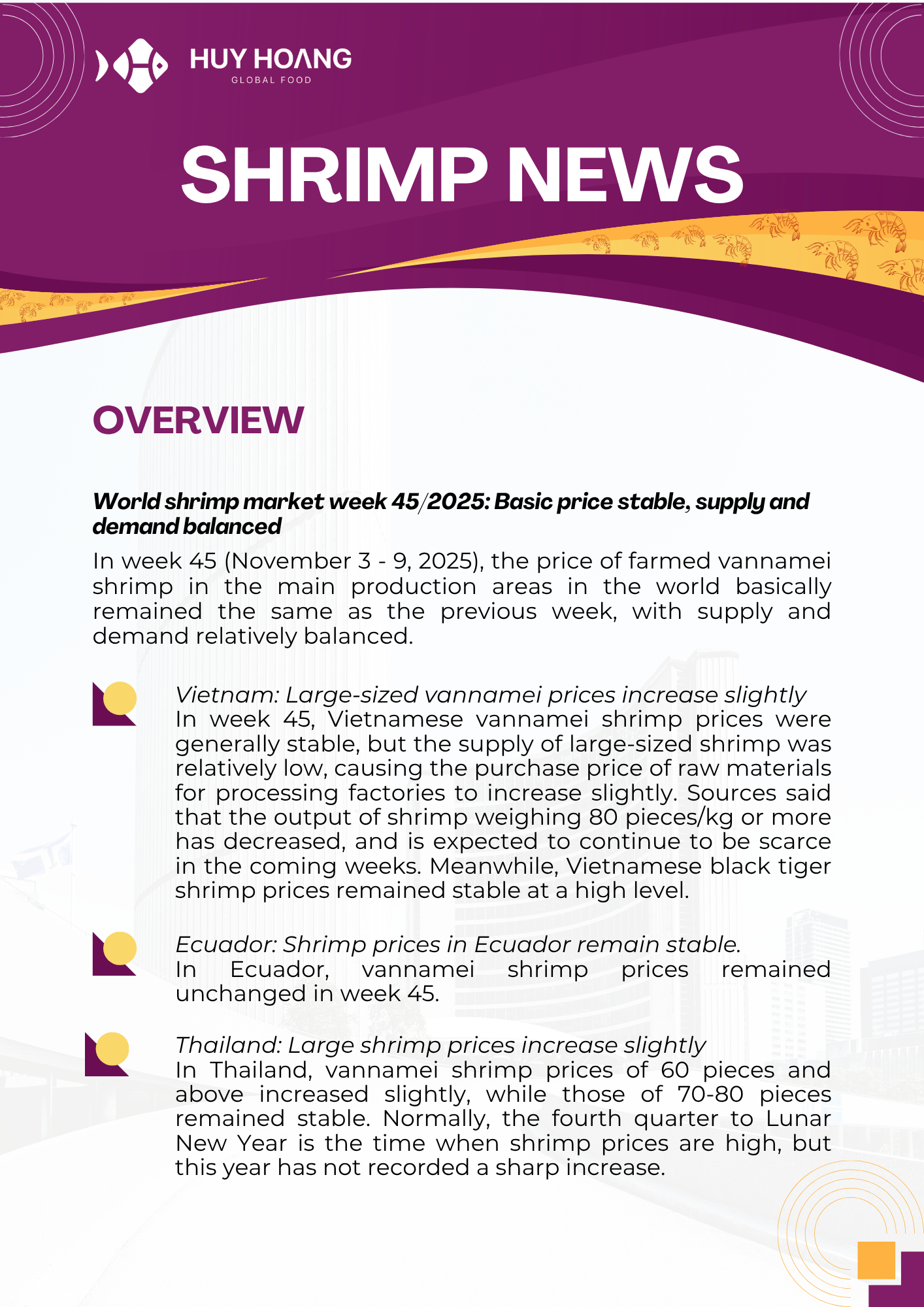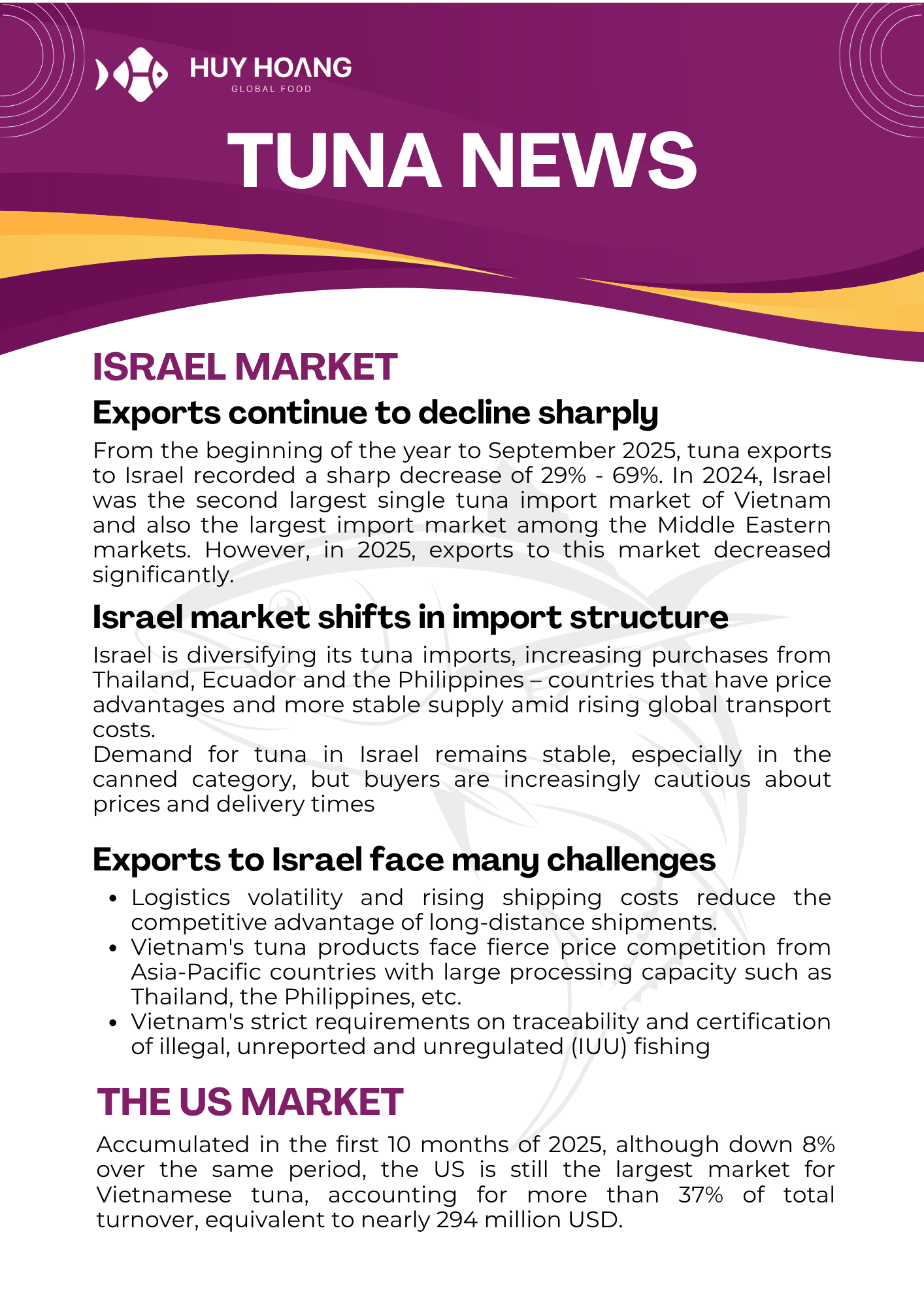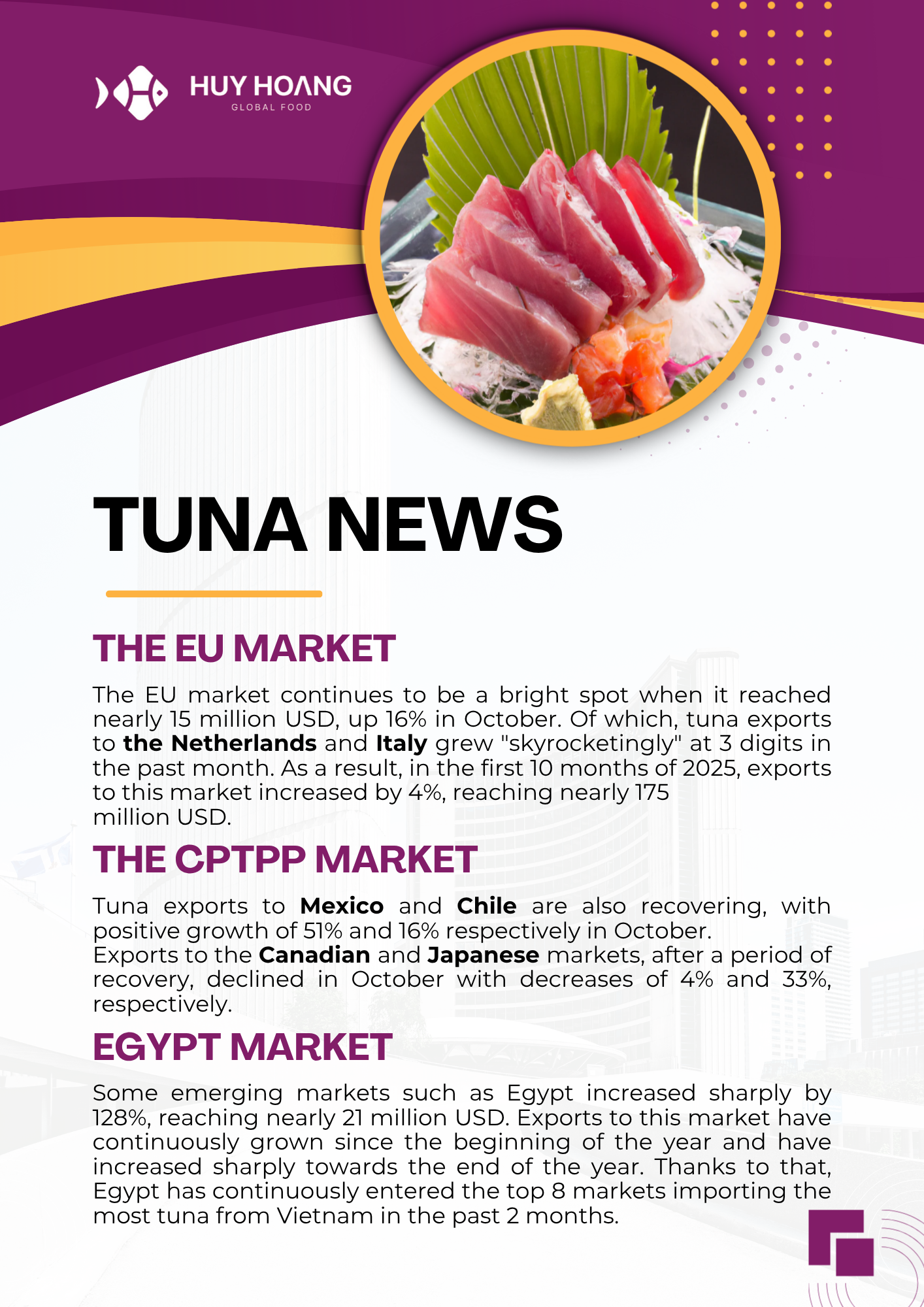 In November 2025, Vietnam’s seafood sector showed steady momentum as pangasius exports reached USD 1.8 billion (+9%) in the first 10 months, supported by strong growth in Japan, China–Hong Kong, and CPTPP markets. Shrimp maintained stable raw material prices amid tightening supply of large sizes, while competition in China intensified as Ecuador and India expanded low-priced offerings. The tuna sector saw mixed performance, with solid gains in the EU, CPTPP and Egypt despite declines in Israel and the U.S. Meanwhile, the global surimi market continued its upward trajectory, driven by demand for convenient, affordable protein and high-grade value-added products, though sustainability and raw material fluctuations remain challenges.